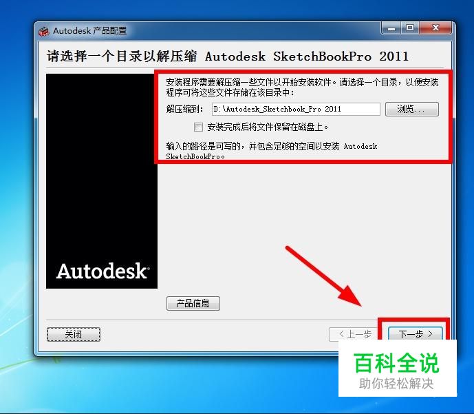 运行Autodesk SketchBook Pro 2011,首先解压文件到自定义文件夹中,自定义好后,点击“下一步”
