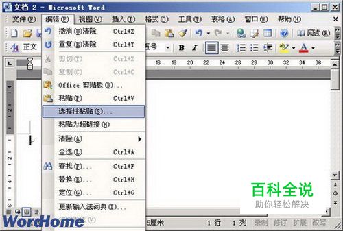 第2步,打开Word2003文档窗口,依次单击“编辑”→“选择性粘贴”菜单命令。