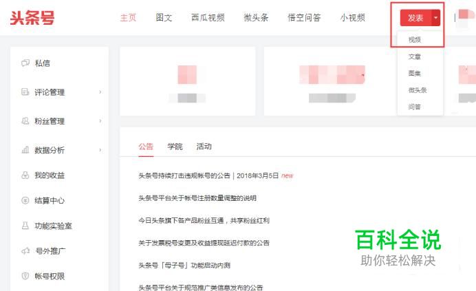 先登录你的头条号后台,可能你看到的和我的不同,我的是新版后台,平台邀请内侧体验的。不过大体上大同小异,右上角有一个发表,鼠标点击下拉菜单,选择视频。