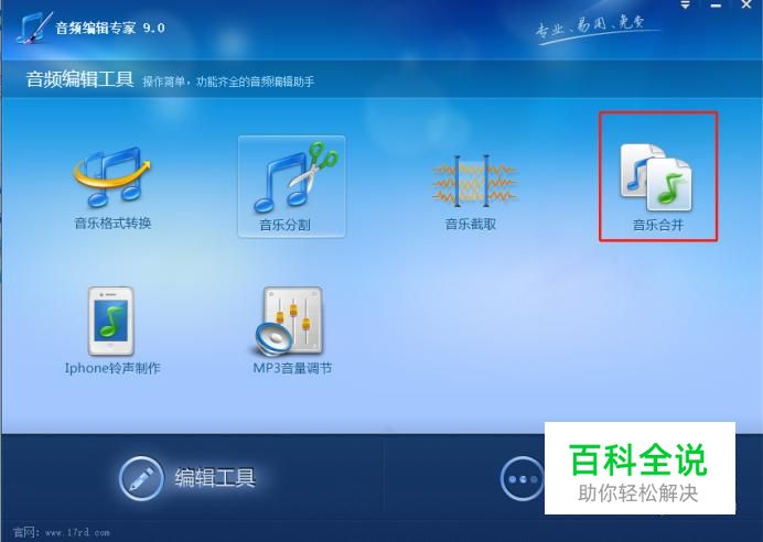 打开音频编辑器专家,然后点击合并音乐,如下图所示