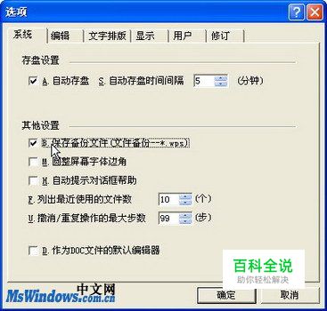 运行WPS文字,依次单击“工具”→“选项”菜单命令,打开“选项”对话框。在“系统”选项卡中选中“保存备份文件(文件备份——*.wps)”复选框,并单击“确定”按钮,如图2010040841所示。 图2010040841 设置保存备份文件