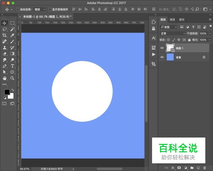 进入PS界面,选择椭圆形状工具,在画布上按住SHIFT绘制一个白色的圆。