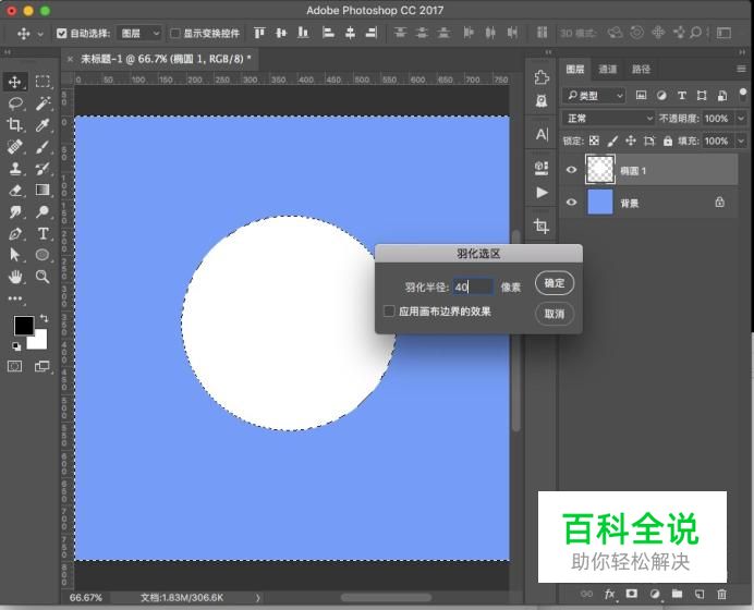 ctrl+左键点击椭圆图层,然后点击“选择-修改-羽化”,对椭圆进行一定羽化半径的调整,具体数值看整个圆的大小。