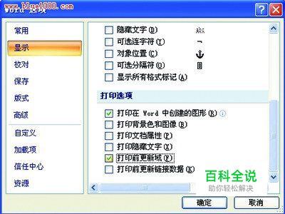 接下来,单击“显示”标签项,然后选中“打印前更新域”复选框(如图2)。 图 2 选中“打印前更新域”
