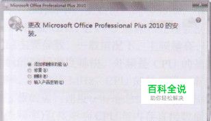 (2)弹出【更改 Microsoft Office Professional Plus 2010的安装】对话框,选择【添加或 删除功能】单选钮,然后单击【继续】按钮。