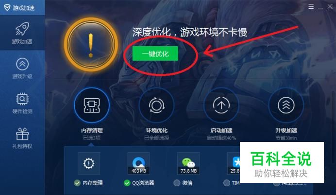 在“游戏加速”界面中,点击“一键优化”,优化游戏运行环境。