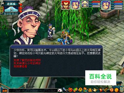 绑定规则:一个小号只能绑定一个大号,一个大号一次可以绑定一个小号,大号绑定小号的总数量不受限制。绑定关系一旦成立,将永远无法解除。绑定成功后,小号只能与绑定的大号以及同一大号绑定的小号之间进行相互给予和交易。 绑定方法:一个大号(60级以上的ID)组队带领一个未绑定的小号(10级以下的ID),前往建邺城(139,25)找“游戏角色绑定使者”申请绑定,绑定需要大号和小号双方进行确认。