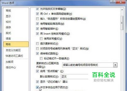 第2步,打开“Word选项”对话框,切换到“高级”选项卡。在“编辑选项”区域选中“中文字体也应用于西文”复选框,并单击“确定”按钮,如图2012010602所示。 图2012010602 选中“中文字体也应用于西文”复选框