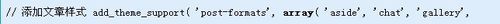 首先打开主题的 functions.php 文件,添加下面的代码,增加 aside、chat、gallery、image、link、quote、status、video、audio 这几种文章样式。