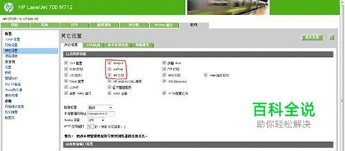 2. 确认为 HP 内嵌式 Web 服务器配置了 AirPrint。 在计算机上打开一个支持的 Web 浏览器,在地址/URL字段中键入本产品的 IP 地址或主机名以打开 HP 内嵌式 Web 服务器。 单击网络选项卡,然后单击其它设置选项。 选中以下复选框: ● Bonjour ● AirPrint ● IPP 打印 单击应用按钮