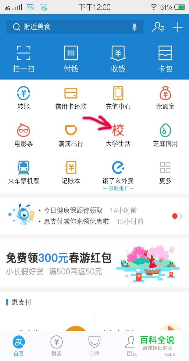 首先打开支付宝,找到大学生活的标志,点击进入。