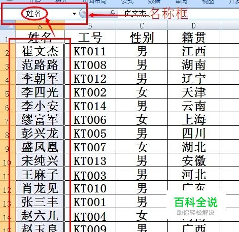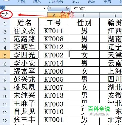 此处选择“首行”和“最左列”来定义以首行标志和以最左列标志命名的名称,可以一次性定义包含有“工号、姓名、......、出生日期”以及“KT001、KT002、......、KT014”等多个名称,并在名称框的下拉列表中能查看到这些名称。