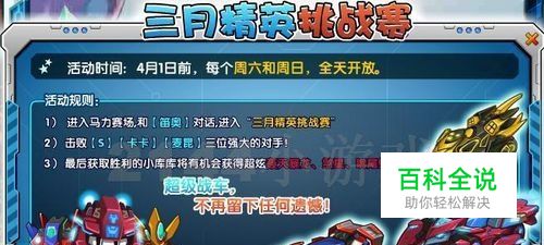 2. 三月精英挑战赛 活动时间:4月1日前每周六、日全天开放 活动规则:精英三人组回归巡回赛!活动期间,进入马力赛场,和笛奥对话,便能开启 “三月精英挑战赛”,击败“S”、“卡卡”、“麦昆”,就有机会获得“轰天暴龙”、“煞星”、“响尾蛇”战车。机不可失,立即动起。
