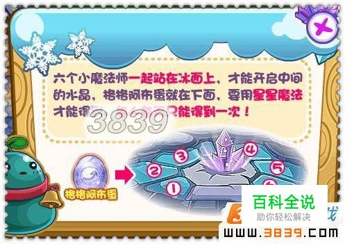 看到晶晶雪域中央的水晶了吗?雪人所说的冰面,就是这个啦。独自一人是无法完成的哦,小洛克们可以等待其他的小洛克,也可以叫上自己的好朋友,一起来开启水晶,6个小洛克们需要分别站在图中的6个位置
