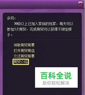 再黑角域继续购买商品,最好把商票余额都买光,然后回到帝都找npc多玛,把从多玛哥或多玛弟处买来的商品全部出售给他后,再交还商贸商票,钱就到手了。每人每天可以完成3次。