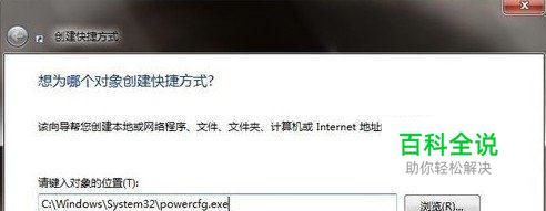 如上图所示,在“对象的位置”选项中,输入“C:\Windows\System32\powercfg.exe”这个据定的位置,点击下一步,接着取名为“节能”,完成快捷方式的创建。