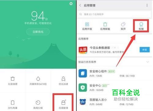 小米手机开启ROOT权限第一步:解锁Bootloader。 打开小米手机“安全中心”界面,在“应用管理”界面中找到“权限”按钮点击进入。