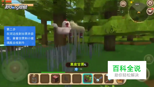 在河边找到甘蔗并获取,拿着甘蔗和小玻璃瓶去找到牛。