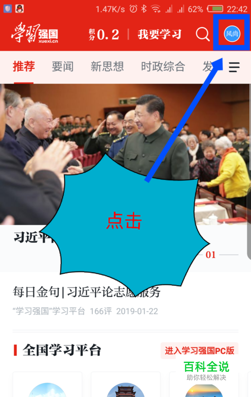 打开学习强国的学习主界面后,点击顶部右上的已经登录的头像。如图所示
