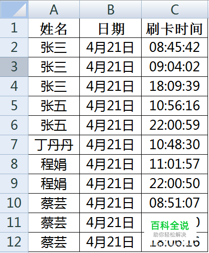 首先,看一下原始数据。一般打卡记录都至少包含姓名(或员工号)、日期和时间信息。实际可能出现的情况包括漏打卡,也就是某个人一天只有一次打卡记录;重复打卡,也就是一天超过两次打卡记录。下面,我们通过操作来识别这些情况。