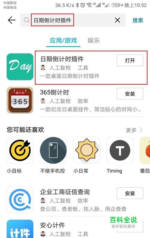 在手机应用市场中输入日期倒计时插件,搜索,选择安装
