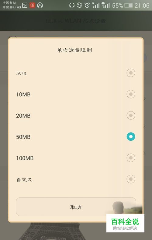 单击便携式WLAN热点进入,选择 单次流量限制,,看看自己设置的流量上限是多少,我们设置为 不限。