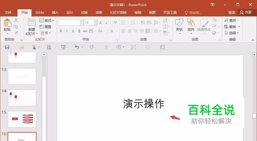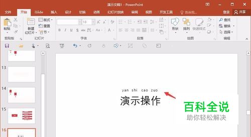 方法一:利用文本+特殊符号,比如这里,我们以文本“演示操作”为例,先在PPT中插入一个文本,包括文字以及拼音。但是我们发现,这样并不完整,拼音还需要进行修改。