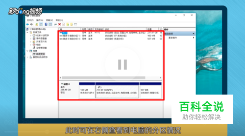 右键单击计算机图标,并在弹出的菜单中依次选择“管理”“磁盘分区”,此时可查看电脑的分区情况。