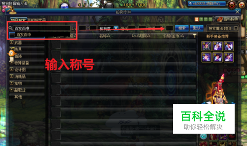在下图红框处,拍卖行填写栏打上称号名称,然后点击箭头所指的搜索。