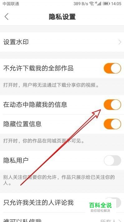 点击该设置项后面的开关,把其设置为开的状态即可。这样我们就可以在快手中隐藏我们的动态信息了。