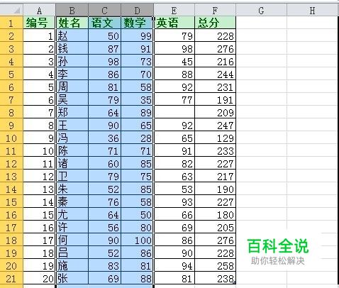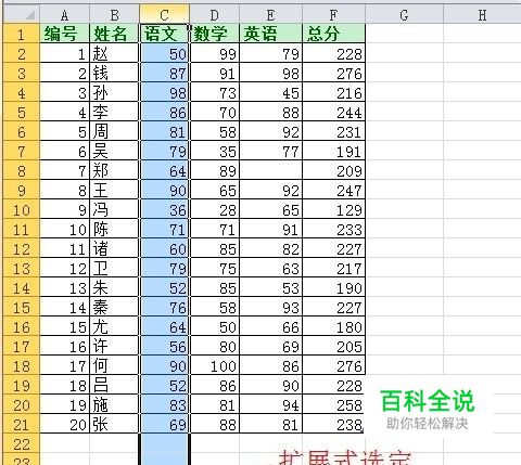 单击C列,即语文一列,此时按下F8键,在状态栏出现扩展式选定 注: 选中F8的作用相当于Shift键,对于选中多行多列还有多个单元格都有很大的用处。