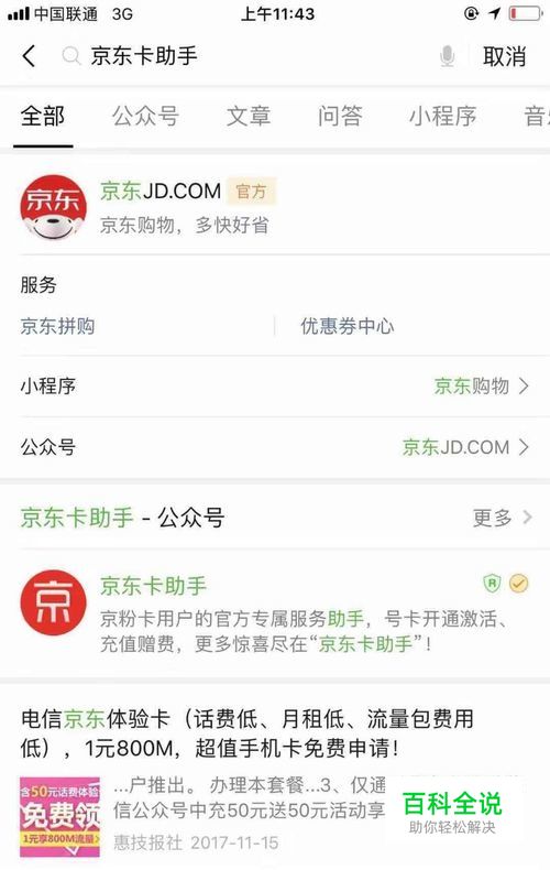 从搜索列表点击“京东卡助手”然后选择关注官方账号