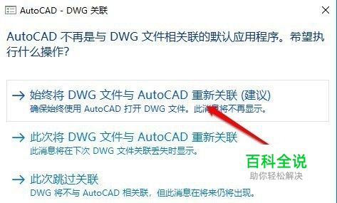 双击打开电脑桌面上的CAD软件图标。然后选择第一项:始终将DWG文件与AutoCAD重新关联(建议)
