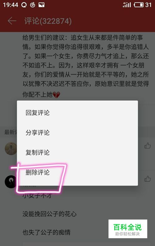 手机版删除评论只需要找到自己的评论,然后点击自己的评论就会出现操作界面,可以回复,可以评论也可以删除。