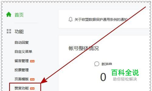 开通微信公众号以后,登陆公众号的首页,在首页菜单上找到“赞赏功能”按钮,点击打开进入下一步操作,如下图示。