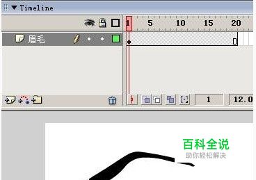 Flash中绘制眉毛。在“眉毛”图层的第一帧绘制眉毛(可手绘,可导入已经处理好的眉毛的图片),并在20帧处按F5键,将帧数延长至20帧。