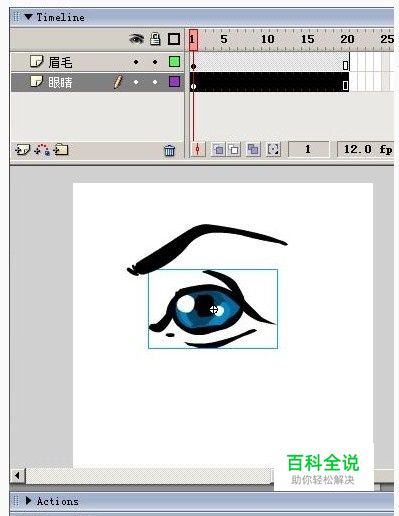 制作睁开的眼睛。新建一层,命名为“眼睛”。在该层的第1帧绘制睁开的眼睛(也可导入处理过的眼睛图片),并转换为Symbol(元件),Graphic(图形元件)或Move Clip(影片剪辑)均可。 注意眼睛和眉毛的位置。