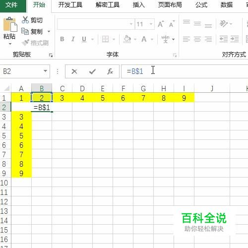 在第一个单元格输入B$1,注意1前面的货币符号,说明第一行锁定,不会变