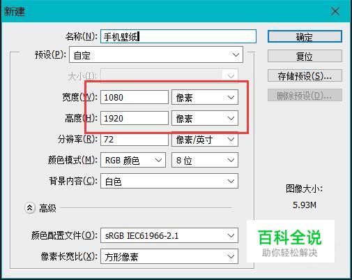 打开ps软件,新建一个文件,宽度和高度设置为和手机分辨率相符的数值,如“1920*1080”,分辨率为“72”,点击确定。