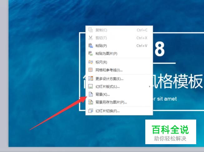 进入之后,在幻灯片上面右击一下,选择“背景”,如图所示。