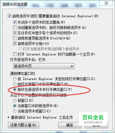 遇到弹出窗口时 选择【始终在新选项卡中打开弹出窗口】,点击【确定】,如下图所示: