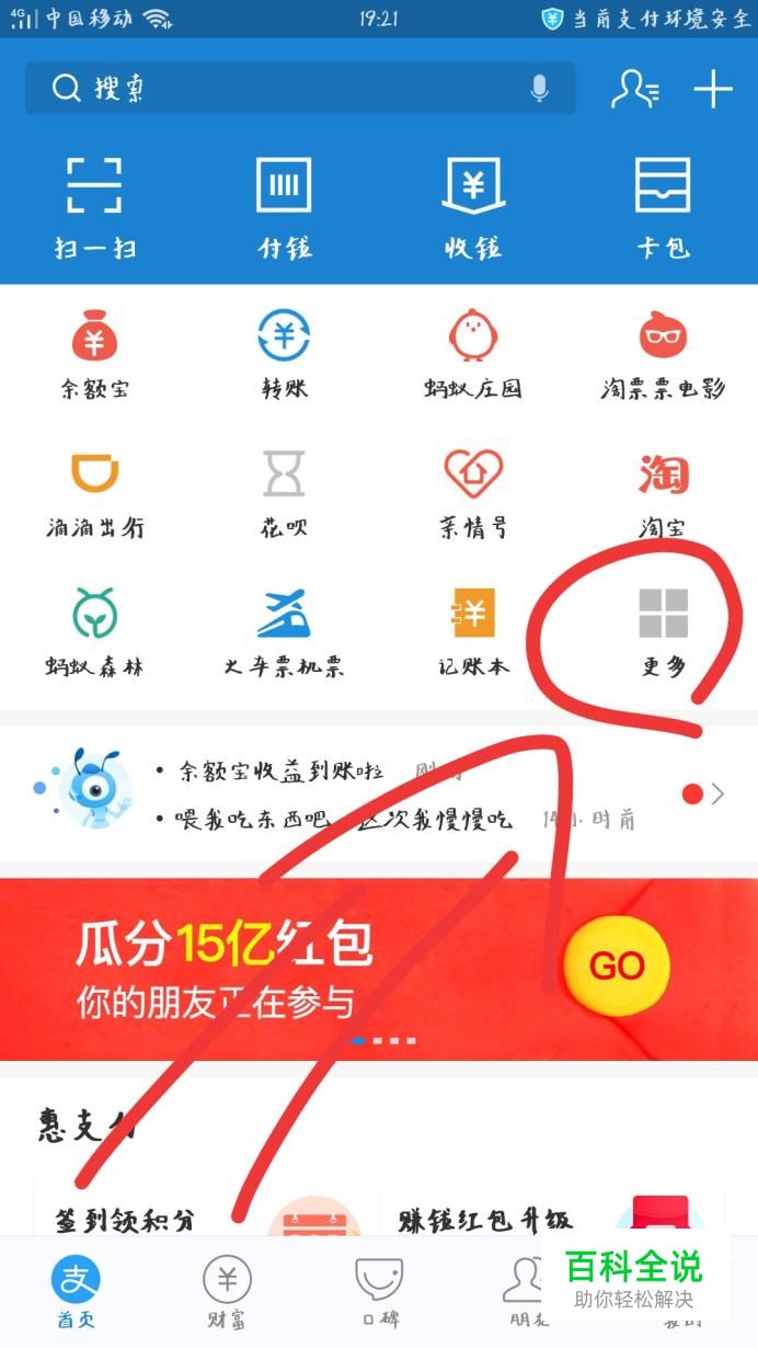 安装成功后点击打开支付宝,在支付宝首页点击“更多”选项。
