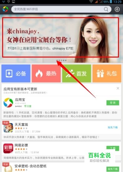 第十二届中国国际数码互动娱乐展览会也就是我们所熟知的ChinaJoy即将开幕,不知道各位有没有准备好门票呢?没有买到的小伙伴们不要着急,应用宝再次为大家谋福利,送上了赢取ChinaJoy门票的机会,不知道各位有没有心动呢?话不多说,小编这就来教教大家怎么通过应用宝来免费获取ChinaJoy的门票! 工具/原料 应用宝 【免费刮奖抽门票】 1.打开手机版应用宝,我们来到精品界面的上方公告栏中。通过翻动公告,找到“来到ChinaJoy,女神在应用宝展台等你”这个公告点开。 2.然后我们就进入到了应用宝送CJ门票的活动界面,很直观的可以看到一个刮奖区出现在我们眼前。我们只需要轻轻滑动手指就可进行刮奖了。 3.抽到的朋友可以看到应用宝为大家送出的从7.31—8.1期间的门票,大家只需要点击下面的填写资料获取门票就可以进行领取。 4.当然,手机不好的朋友也不要气馁,大家可以再试一次,相信通过努力各位一定可以成功的获得门票的。 【分享朋友圈领巨额奖品】 1.挂完奖之后,大家可以能够看到下方的分享朋友圈,还能去E7应用宝展台领奖品哦这个选项,大家可以通过分享来获取奖品。 2.同时,点击界面下方的向下的箭头,大家可以轻松翻阅在ChinaJoy中E7展台的各位帅哥美女以及特斯拉等超级豪礼。 3.翻到最后一页,是ChinaJoy的地址,也就是上海新国际博览中心,大家可以根据地图该地址参加活动。