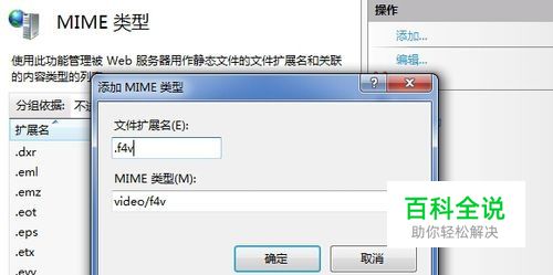 点击右侧的“添加”,在弹出框里面,文件扩展名填写.f4v,MIME类型填写video/f4v,点击“确定”后f4v就添加成功了;