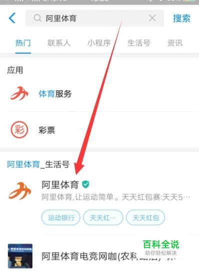进入之后,搜索“阿里体育”,点击并进入,如图所示。