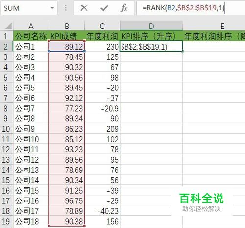 然后在就是公司利润排序了,同理,在E2单元格内输入公式“=RANK(C2,$C$2:$C$19,0)”,然后输入回车