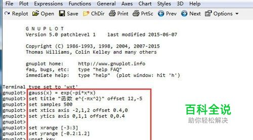 第一个问题:坐标轴箭头及标签的设置。在科技论文或书籍的插图中,往往要显示坐标系的几个坐标轴标签及箭头还有刻度。如果没有设置好,就达不到目的。作为例子,画一个高斯函数图象。打开gnuplot,输入如下代码,回车确认。