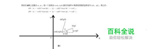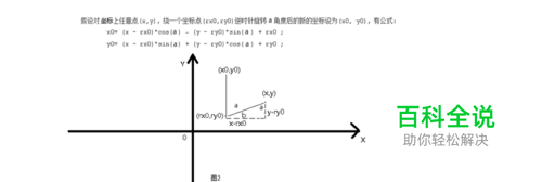 综上所述,对图片上任意点(x,y),绕一个坐标点(rx0,ry0)逆时针旋转a角度后的新的坐标设为(x0, y0),有公式: x0= (x - rx0)*cos(a) - (y - ry0)*sin(a) + rx0 ; y0= (x - rx0)*sin(a) + (y - ry0)*cos(a) + ry0 ;
