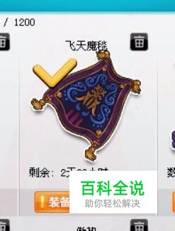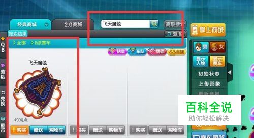 第一种方法是直接购买: 点击商城——进入商城界面以后点击搜索栏输入飞天魔毯——点击搜索,即可出现飞天魔毯的购买界面。