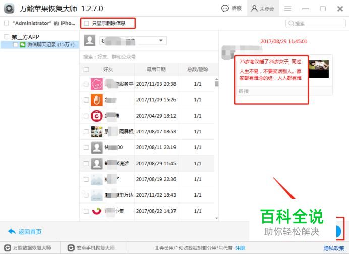 最后从界面上找到已删除的聊天记录,然后选择后点击恢复按钮,就可以将聊天记录恢复了。